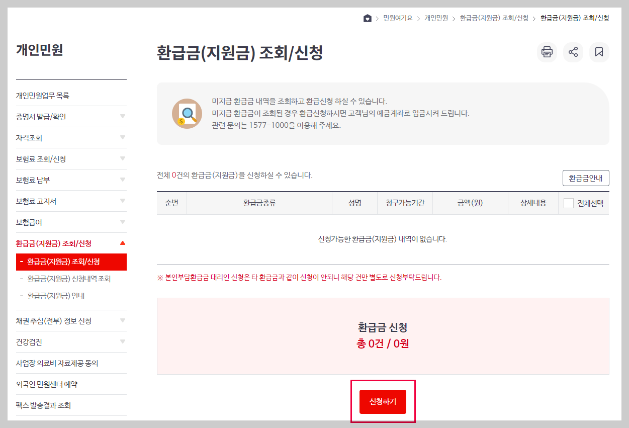 국민연금 환급이 있다면 신청가능한 환급금 내역과 함께 환급받을 금액이 나오고 바로 아래 신청하기 버튼을 통해서 환급금 신청도 바로 할 수가 있습니다.