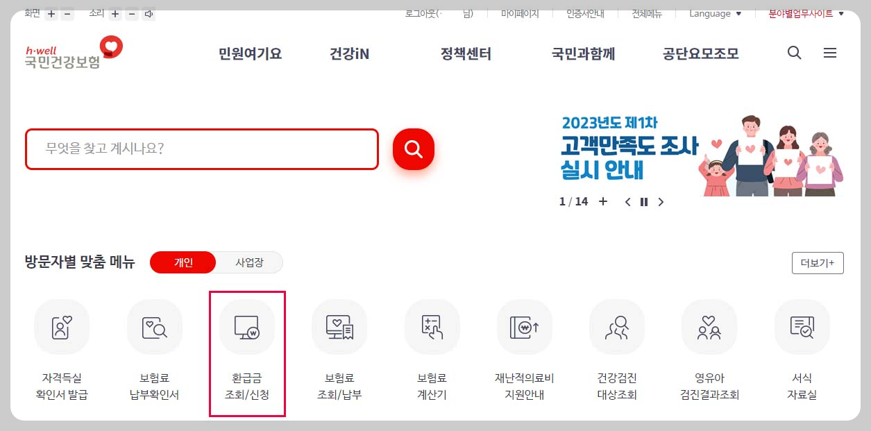 국민연금 환급금 조회는 국민건강보험 홈페이지에서 바로 조회가 가능합니다. 공인인증서 또는 카카오, 네이버, 페이코, PASS 등 간편인증을 통해서 로그인한 후 메인화면에 보이는 '환급금 조회/신청'을 클릭하면 됩니다.