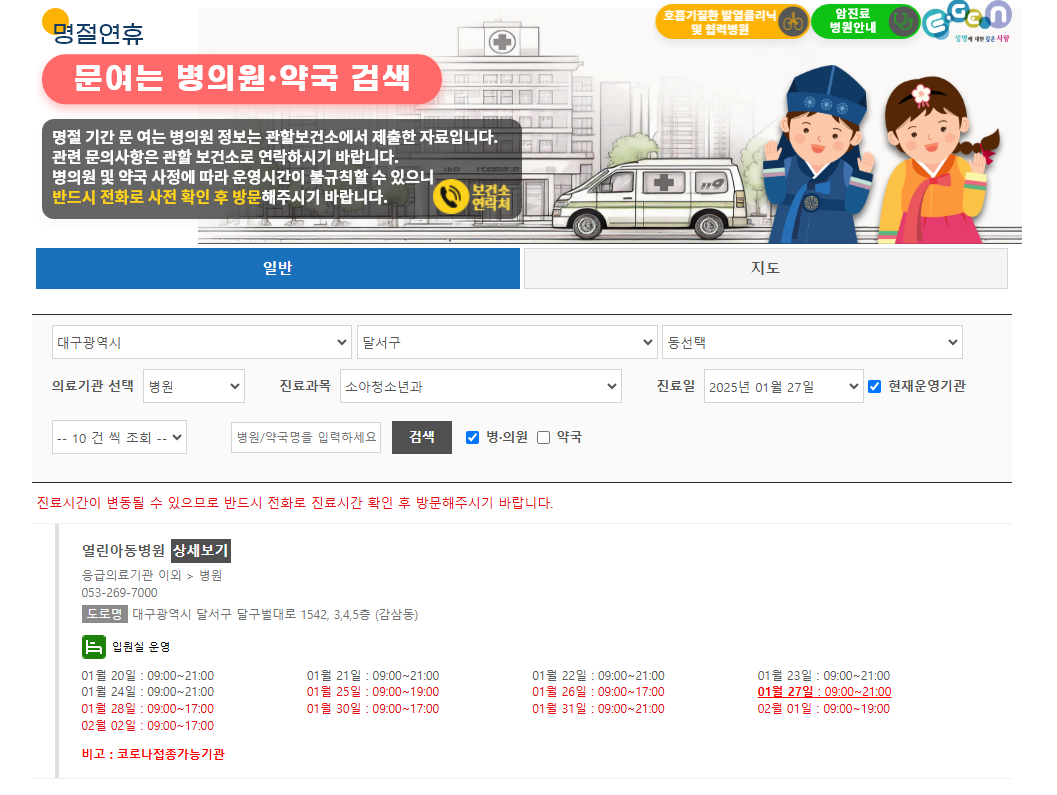 응급의료포털에 제공되는 정보는 각 지역 관할 보건소에서 제출한 자료를 바탕으로 하고 있습니다. 검색은 일반검색과 지도검색이 가능합니다. 각 탭에 지역, 의료기관을 설정하고 진료일에는 "현재 운영기관" 체크하면 됩니다. 그러면 현재 운영 중인 병원/응급실 리스트를 볼 수 있고 "자세히 보기"를 클릭하면 명절진료 운영시간, 진료과목, 실시간 병상 정보 등을 확인할 수 있습니다. 지도 검색시 지도로 병원 위치를 파악할 수 있습니다.