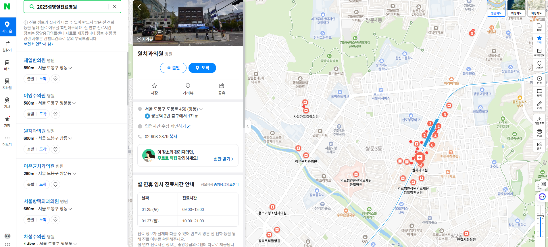 설 연휴 문여는 병원/응급실을 네이버 지도로 찾을 수가 있습니다. 네이버 지도 상단에 보면 '명절진료" 탭이 있습니다. 탭을 누르면 자신의 위치에서 가까운 병원/응급실 목록이 나옵니다. 목록 중 하나의 병원을 선택하면 설 연휴 임시 진료시간에 대한 안내 사항을 확인할 수 있습니다.