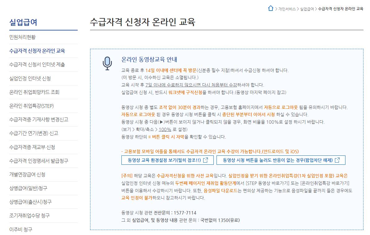 고용보험 홈페이지에서 수급자격 신청자 온라인 교육을 시청합니다. 온라인 교육은 시작 후 7일 이내 수료하지 않으면 처음부터 재 수강해야 합니다. 그리고 온라인 교육 종료 후 14일 이내에 관할 고용센터를 방문하여 수급신청을 해야 합니다.